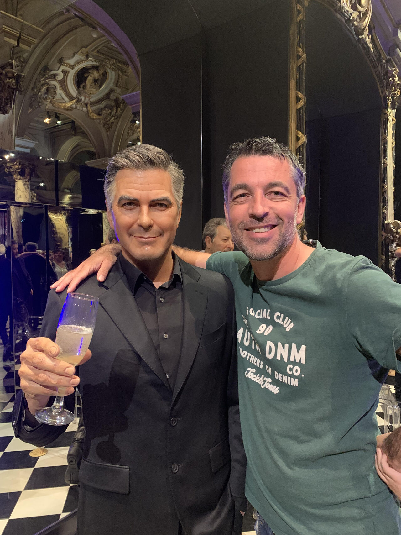 Si ce jour-là, j'avais su que je rencontrerais Georges Clooney, J’aurai quand même mis un tee-shirt moins dégueulasse 😬 Je dois vous avouez, j’ai longtemps pratiqué un petit jeu, que je trouvais sans conséquence, mais qui me faisait bien rire. Celui de m’incruster dans des soirées ou événements. Arriver à rentrer quelque part sans y être invité était un vrai plaisir. (attention, il y a eu certainement bien plus d’échecs que de réussites dans ces entreprises, mais c'est la vie). Le pire dans tout ça, c’est que je restais assez peu.  Parfois dans des expos, je m’attardais pour profiter des œuvres. Et je ne dis pas que je ne me suis pas laissé tenté occasionnellement par les bonnes pâtisseries présentées.😋 Non, mon objectif était atteint, alors la plupart de temps, je repartais assez vite. Mais avec le temps, j’ai beaucoup moins joué à tout cela voir plus du tout. Jusqu’à la semaine dernière. Paris. Un très bel hôtel. De très belles voitures. Beaucoup de mondes. Là, je sens les fourmis dans les doigts, mon cœur qui bat un peu plus vite. Et un petit sourire poindre à la commissure de mes lèvres. Vu comme j’étais habillé, impossible de passer par la porte d’entrée. Direction la porte de services. (il m’a fallu quelques minutes pour la trouver) Profitant d’un afflux de personnes, je finis par passer (petit tips : toujours marcher avec conviction, tête haute, pas rapide). Et très vite, je me retrouve dans la salle principale. La malgré tout, petit malaise : que des gens bien habillés, dames et monsieur très chics. (et je vous rappelle que j’ai ce vieux tee-shirt). Je ne vais clairement pas pouvoir rester longtemps (la sécu …). J’en suis là de mes réflexions, qui je vois ? Georges. 🚀 Alors, je me dis : quitte à ne pas rester longtemps, autant terminer en beauté. Je m’approche tranquillement (et bon sang, ce gars n'est pas aussi grand que je ne l’aurais cru, mais il est d’un charisme incroyable). Je sors mon plus bel anglais, lui raconte une petite bêtise qui le fait marrer et toujours avec humour, lui demande si je peux prendre une photo. À ma grande surprise, il accepte, même si je sens que ça le gonfle un peu. Pris dans l’euphorie, je pose même ma main sur son épaule (et ça j’en ai un peu honte avec le recul). En attendant, photo prise. 🍾 Après cet exploit, je décide de partir très vite, car je vais me faire griller. Direction la sortie (toujours pas par la principale, on évite la sécu) Et là, je marche dans les rues de Paris, un peu ébahis moi-même parce ce qu’il vient de se passer. Je rentre à mon hôtel et m’endors (difficilement). Lé réveil sonne. Et je me souviens de ma très belle journée d’hier. Bref, Je suis allé au musée Grévin. (et j'ai payé l'entrée). #storytelling #mytho #brandingalacon #les26mousquetaires